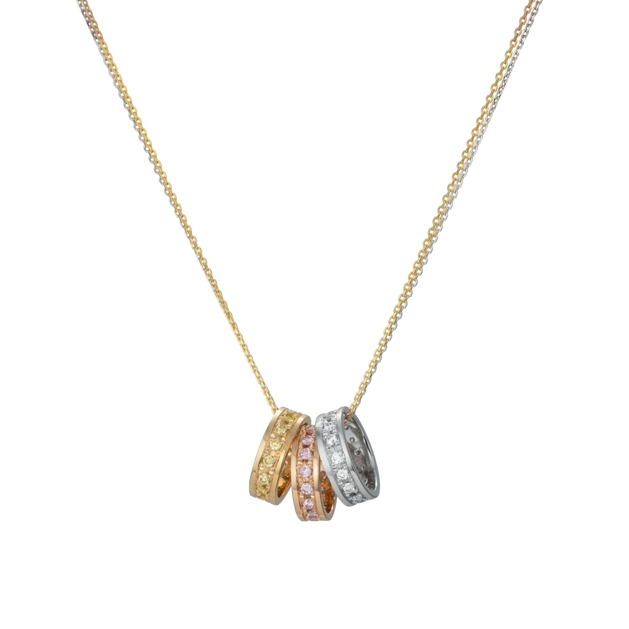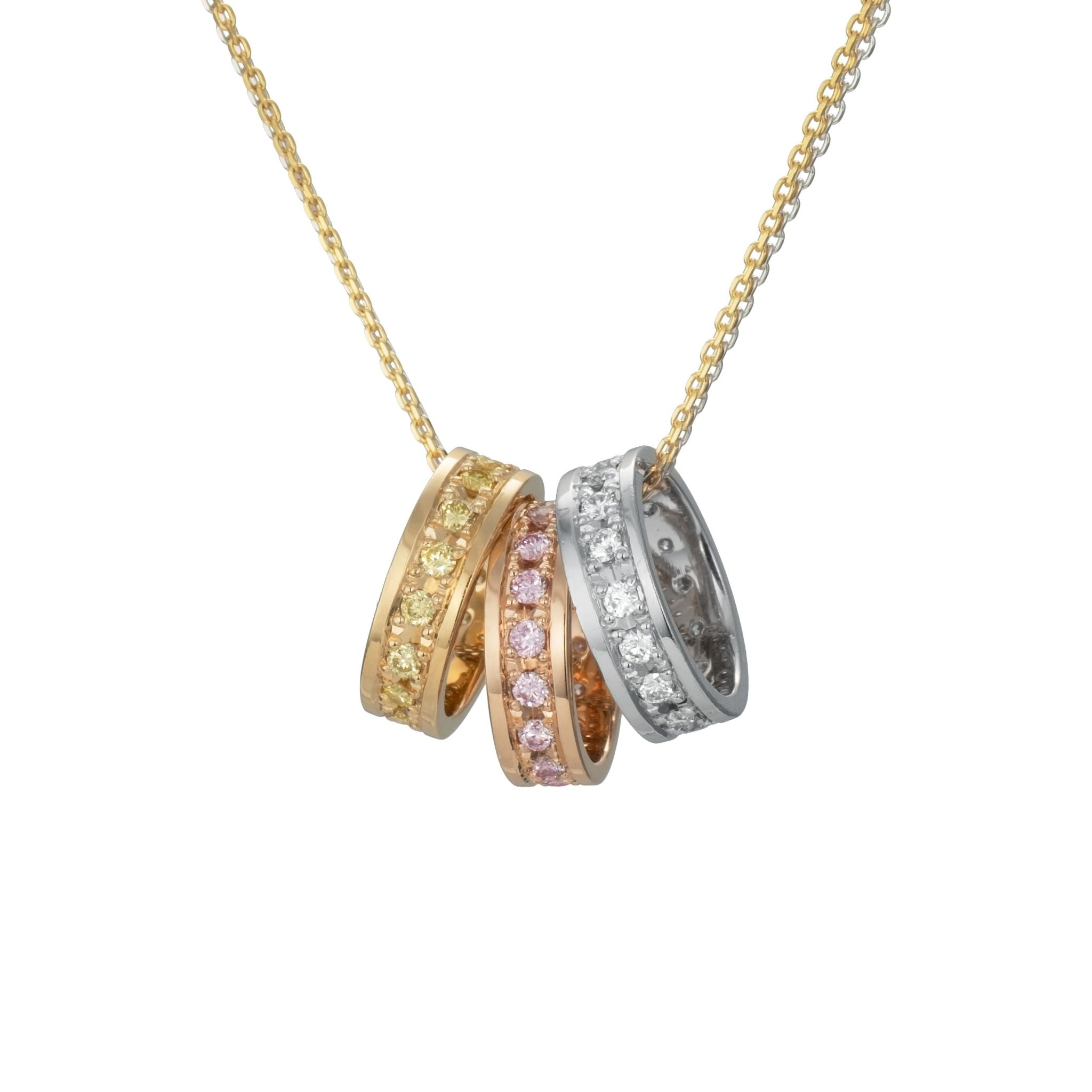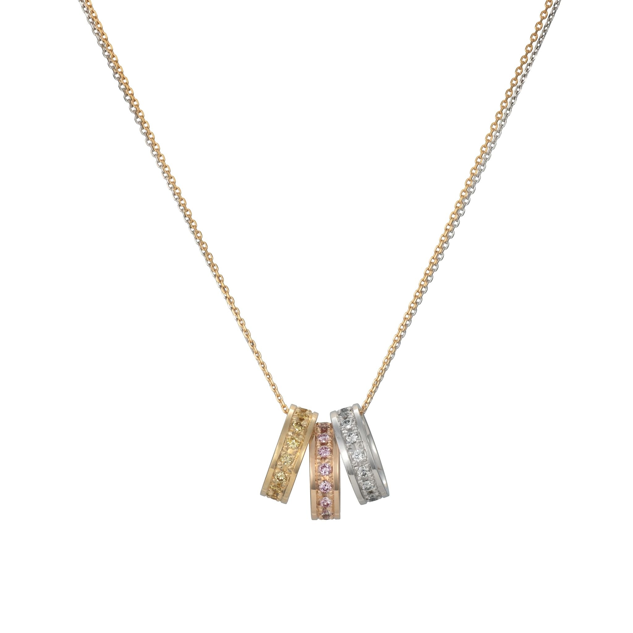 ピンク・イエロー・ホワイトの3色の天然カラーダイヤモンドを一つのペンダントに收めた、希少性の高い一点です。それぞれのダイヤモンドがそれぞれの色彩を引き立て、身に着けるだけで华やかな存在感を放ちます。