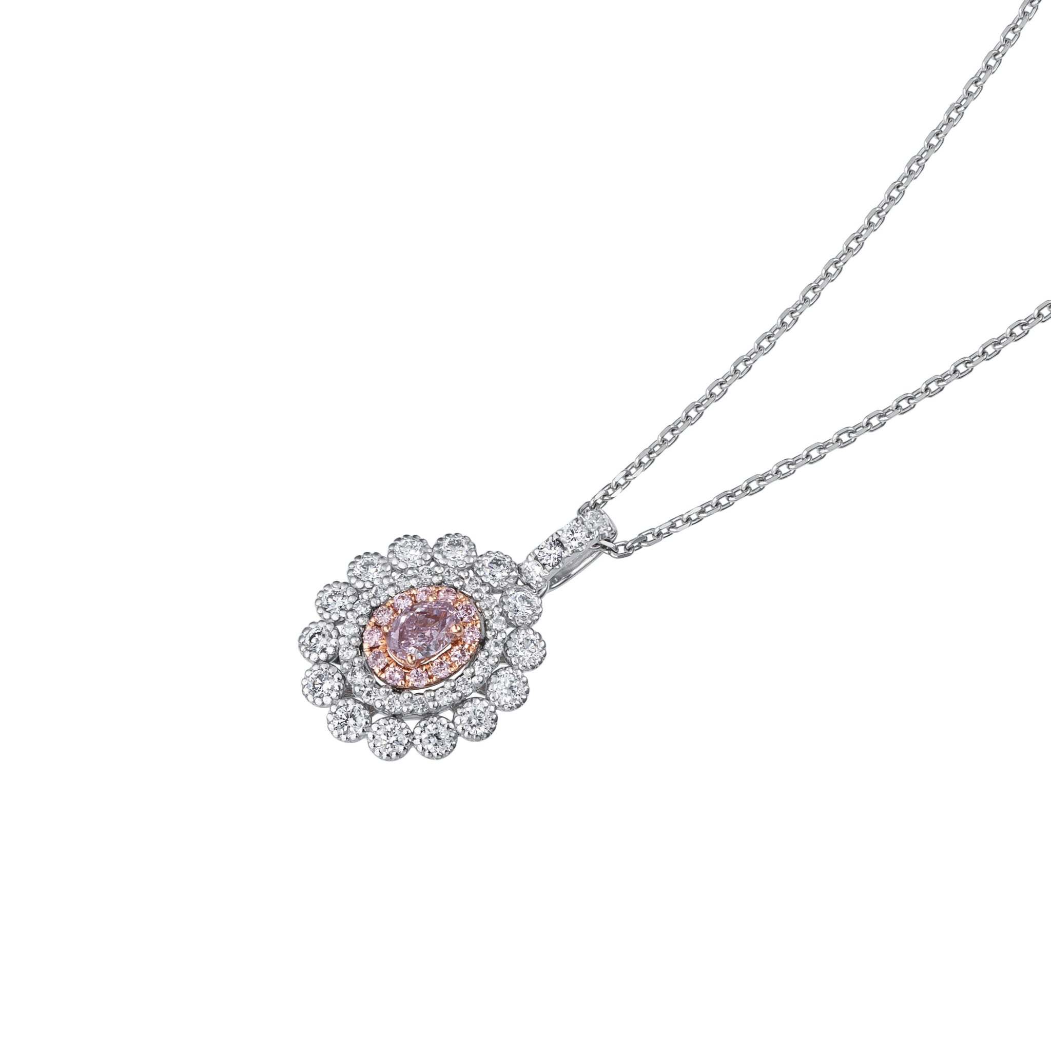 天然の「ファンシー パープリッシュピンク」グレードの0.206ctオーバルカットダイヤモンドをメインストーンに。ピンクとパープルが調和する深みのある色彩が、首元で上品に輝きます。