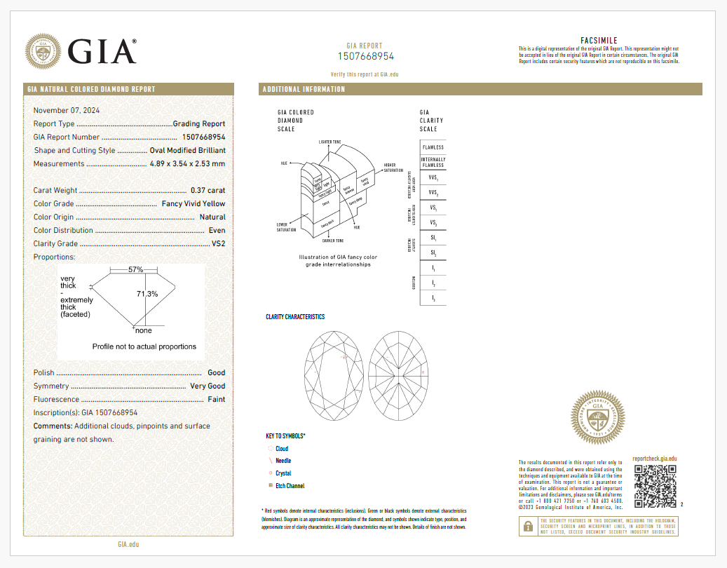 0.37ctのオーバルカットが、イエローの色彩を最大限に引き立てます。クラリティはVS2で、肉眼では内包物は見えず、美しい輝きを楽しむことができます。CGL(中央宝石研究所)の鑑定ソーティング付きで、品質も保証されています。